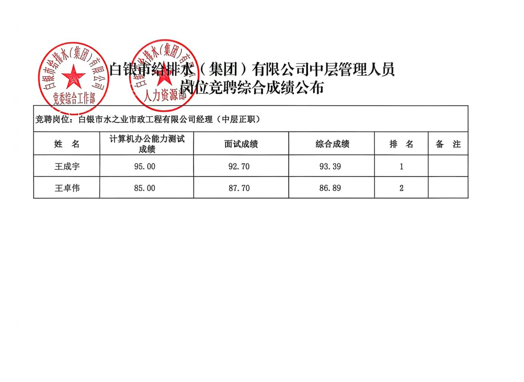 白銀市給排水(集團(tuán))有限公司中層管理人員崗位競聘綜合成績公布